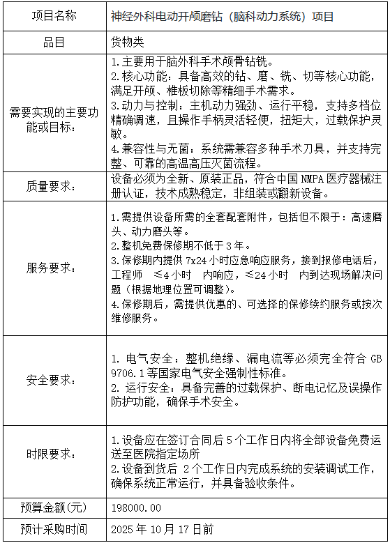 应医院需求,我院2025年10月份拟对神经外科电动开颅磨钻