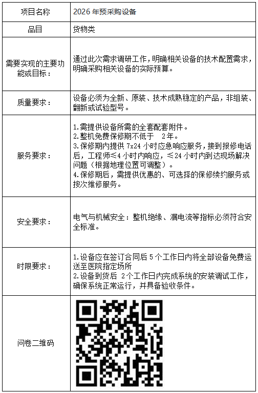 根据医院业务发展需要,我院拟开展2026年度预采购设备的线上需求调研询价工作(以下简称“需求调研”),现将有关事项公告如下: