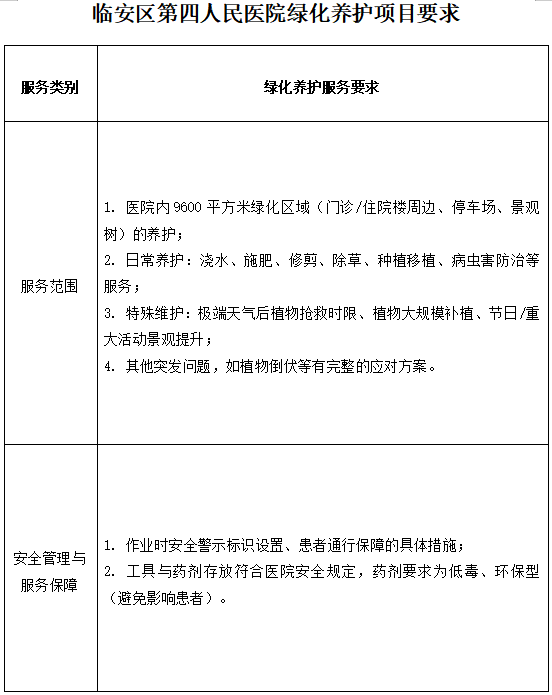 一、项目名称:临安区第四人民医院绿化养护服务项目。